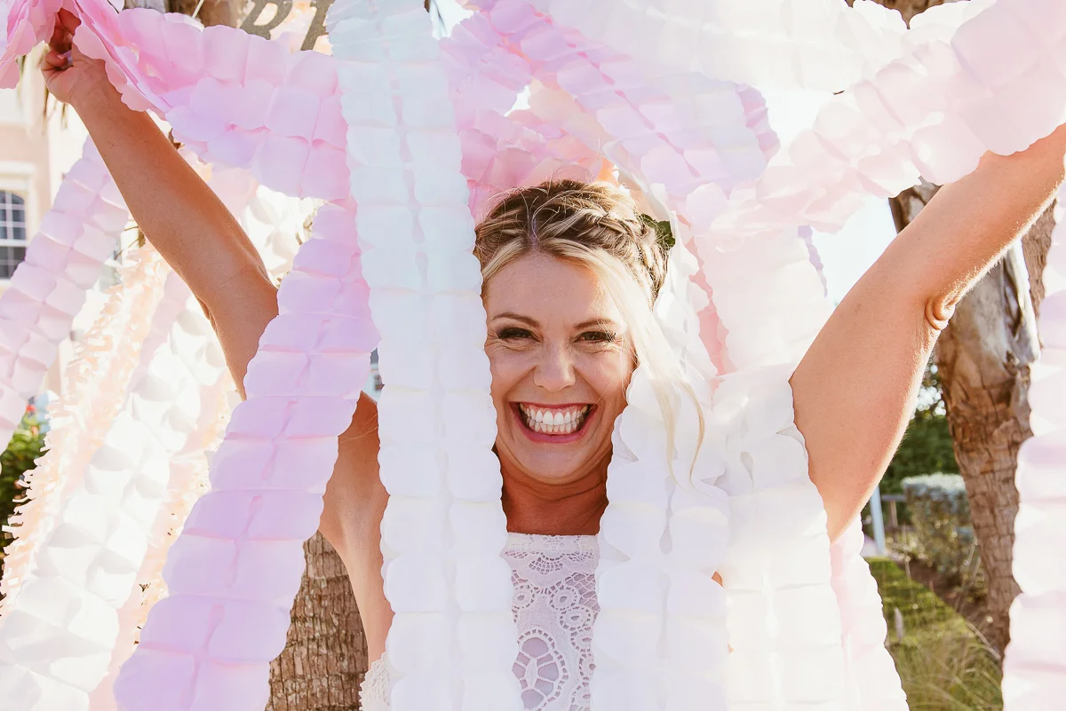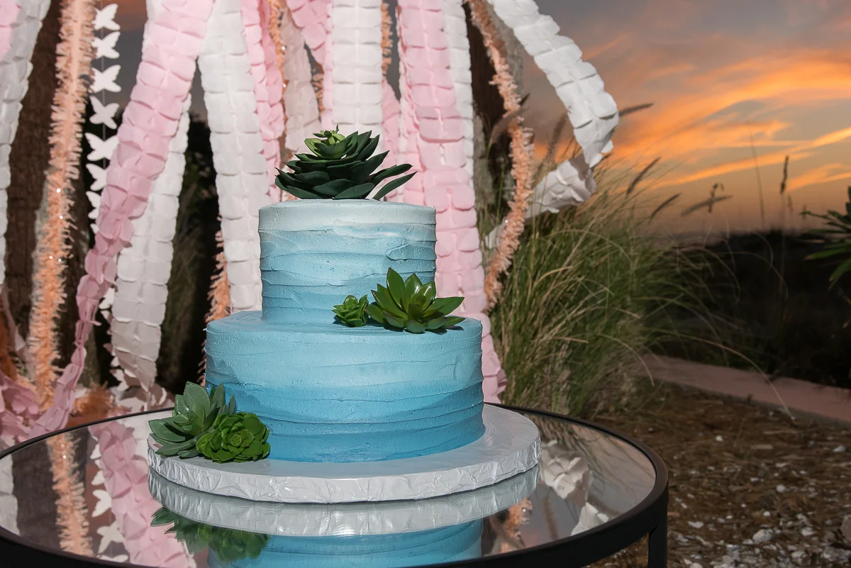 Tiffany and Nick had a beautiful pastel colored wedding at Indian Rocks Beach . The couple rented a backyard with an ocean view. Her dress was flowy, flowery, and fun just like her. It had spaghetti straps and it looked comfortable and fit perfectly with the laid back theme. The decorations were pastel pink and blue with lots of shells, flowers, and leaves. The chairs were wooden and there were long pink and white paper ribbons flowing throughout the backyard. Everything had an ocean feel to it. It was such a beautifully decorated place that fits perfectly with their interests, their theme, and their relationship. The ceremony was planned by Tide the Knot Beach Weddings.
